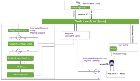 46]. The architecture of the chatbot consists of a combination of various technical and functional components that work together to provide an appropriate and up-to-date response to user queries. These components work together to enable a chatbot to understand user input, retrieve information from its knowledge base, and generate an appropriate response in real time. In general, the developed chatbot is composed of four components: user interface, natural language processing, information retrieval, and response generation. In each of those components, a variety of technologies have been used emphasizing their accessibility and public availability. As the primary part of this research, information retrieval focuses on the mechanism for retrieving dynamic knowledge from the world wide web which we refer to as the Internet Wizard.