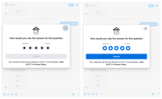 The turn-level user satisfaction evaluation method in this research is implemented using the Customer Feedback Template Messaging API. In this context, a template known as the “Rate the Answer” section has been incorporated into each chatbot response. This template prompts the user to rate their satisfaction with the chatbot response by presenting a rating window when the user clicks the “Rate the Answer” button. The rating scale ranges from 1 to 5 and is based on the Customer Satisfaction Score (CSAT) methodology as illustrated in