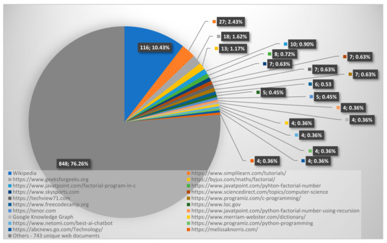 Figure 5, the top twenty most frequently used web documents by the chatbot to generate answers to user queries were identified and classified into separate categories in the pie chart. The remaining web documents, which were referenced less frequently and therefore demonstrated a high degree of diversity, have been aggregated into a collective category labeled “others”. This category represents web documents that were used between one and three times, consisting of 743 unique web documents. This finding indicates that the Internet Wizard mechanism utilized a wide range of web documents to generate responses to user queries, which can be attributed to the diversity of the queries’ topics.