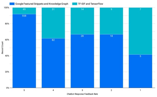 Figure 7 depicts that the majority of responses sourced from Google featured snippets and knowledge graphs received a rating of 5. However, when TF-IDF and TensorFlow were used as sources of answers for user-input questions, the average feedback rating decreased to 3.81. Responses sourced from TF-IDF and TensorFlow received lower ratings compared with those sourced from Google’s featured snippets and knowledge graphs, as illustrated in