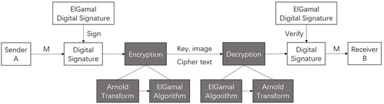 The framwork is divided into two main parts: the digital signature part and the encryption/decryption part. The digital signature part uses the ElGamal Digital Signature algorithm, and the encryption/decryption parts mainly apply the Arnold Translation and ElGamal Algorithm. Refer to Figure 1 for the specific process.