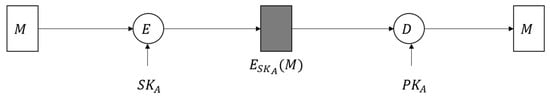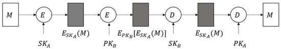 The specific steps for signing are as follows (refer to Figure 2): M is plaintext, E is the encrypted message (as the signed file), D is the decrypted message, SKA is the private key of Sender A, and PKA is the public key of Sender A.
