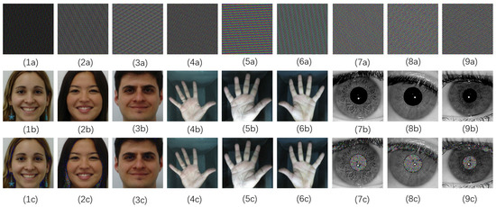 The ciphertext image with Gaussian noise. (1a–9a) are the encrypted images with Gaussian noise; (1b–9b) are the plain-text images; (1c–9c) are the decrypted images.