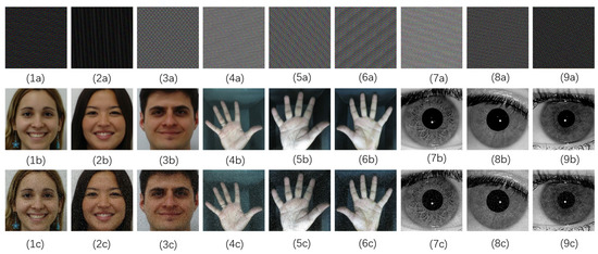 The proposed algorithm is implemented using Python 3.10.9 by PyCharm 2022.2.3 on the Windows 11 platform using a personal computer with an 11th Gen IntelI CITM) i7-1195G7 @ 2.90GHz and 2.92 GHz Processor. To verify the performance of the proposed framework, we tested it on three distinct modalities coming from three biometric datasets. The face dataset is the FEI (Fundação Educacional Inaciana) dataset [39]. There are 2800 images in this database with 200 subjects, and the images are colored on a homogeneous white background. The face images are in JPG (*.jpg) format, where the size of each face image is 640 * 480 pixels. The palmprint dataset is the IIT Delhi Palmprint Image Database version 1.0 [40]. The database consists of hand images collected from students and staff at IIT Delhi, New Delhi, India. The database was collected from 230 users, with all images in bitmap (*.bmp) format. The resolution of these images is 800 * 600 pixels, and all of these images are available in bitmap format. The dataset contains 5202 images. The iris dataset is from IIT Delhi Iris Database version1.0 [41]. This dataset mainly consists of the iris images collected from students and staff at IIT Delhi, New Delhi, India. The available database is from 224 users, and all the images are in bitmap (*.bmp) format. The resolution of these Images is 320 * 240 pixels and contains a total of 1120 images. The experiments selected three images randomly from each database. Figure 5 illustrates the original images regarding the biometric data, where samples 1 to 3 are face images, samples 4 to 6 are palmprint images, and samples 7 to 9 are iris images.