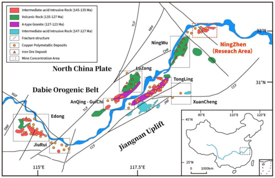 The study area is located in the Ningzhen region, which is part of LYRMB in eastern China. The LYRMB is one of the most important metallogenic belts in China, containing over 200 Cu-Fe-Au-S deposits. This belt comprises the eastern portion of the Yangtze block in central-eastern China and spans approximately 600 km from Hubei Province in the west to Jiangsu Province in the east. The LYRMB includes a Paleozoic basement and a sequence of Mesozoic sedimentary rocks [27]. The exposed stratigraphic sequences range from Silurian to Triassic and consist of shallow marine sandstones, shales, quasi-molasse and lacustrine sediments. Cretaceous volcanic rocks overlay the sediments, and the region was subsequently covered with red-bed clastic sedimentary rocks, with minor basalt.