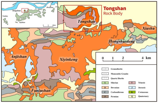 Magmatic rocks are well-developed in this region, mainly forming during the Yanshanian period (Bai et al., 2022). As shown in Figure 1, moving from west to east, these ore clusters are: (1) Edong Cu-Fe-Au district, (2) Jiurui Cu-Fe-Au-W district, (3) Anqing-Guichi Cu-Mo-Au district, (4) Luzong Fe-Cu district, (5) Tongling Cu-Au-Fe-S district, (6) Nanling-Xuancheng district (Lu et al., 2022), (7) Ningwu Fe district and (8) Ningzhen Cu-Mo-Fe-W-Pb-Zn district. Most of the deposits are associated with Yanshanian magmatic rocks and are skarn-porphyry, strata-bound type deposits. The Tongshan skarn Cu-Mo deposit is located in the Ningzhen region. The structural framework of the Ningzhen region comprises three anticlines and two synclines in the west-east direction. The magmatic rocks in this region are primarily early Cretaceous, 20 Ma younger than other ore regions in LYRMB [28]. There are two skarn-porphyry type Cu-Mo deposits, e.g., Anjishan medium-sized porphyry Cu deposit and Tongshan skarn Cu-Mo deposit (Figure 2). The magmatic rocks in this district are mainly quartz diorite, named Anjishan, Funiushan, Xiyingkeng, Tongshan, Hongshuidang, and Xiashu plutons.