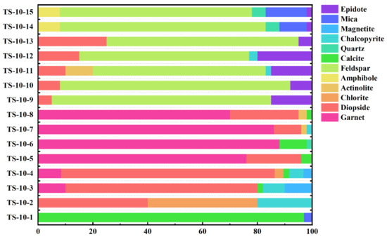 To document the various phases of skarn formation, we collected a total of 15 hand specimens from the TS-10 skarn section. Among them, Nos. 14–15 were collected from the granite belt, Nos. 8–13 from the inner skarn belt, Nos. 2–7 from the outer skarn belt, and No. 1 from the marble belt. Based on micro-petrographic observations, we estimated the mineral content in each sample. As shown in Figure 4, garnet is observed in samples Nos. 3–8, traversing the demarcation between inner skarn and outer skarn.