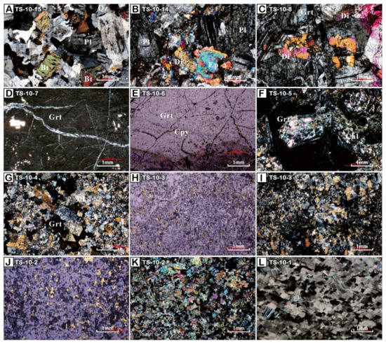 The fresh granodiorite (Figure 5A, TS-10-15) is composed of quartz (25%), feldspar (~45%), biotite (~15%), and amphibole (15%). Near the skarn zone, plagioclase in granodiorite exhibits slight sericitization, and new minerals such as chlorite and diopside (0.1–0.2 mm) become more prominent, while Fe-rich amphibole and biotite minerals disappear (Figure 5B, TS-10-14). Moving further from the intrusion, garnet and pyroxene minerals increase in prominence, and chlorite disappears (Figure 5C); however, occasional chlorite veins are found within garnet. In this area, garnet and pyroxene are the primary minerals, with the proportion of garnet being five times greater than that of pyroxene. The proportion of garnet can increase to over 90% as one moves further from the intrusion in the eastern direction, where most garnets are euhedral, defining the garnet-enriched outer skarn zone. Chalcopyrite (cpy) veins also occur within cracks in the garnet (Figure 5E, TS-10-6). Chloritization and epidotization are evident in the core of garnet (Figure 5F, TS-10-5). As one continues further from the intrusion, fine-grained pyroxene appears, and its proportion relative to garnet gradually increases (garnet:pyroxene < 1:5) (Figure 5G, TS-10-4). Cpy and magnetite growth and abundance increase at the boundaries of the main minerals (Figure 5H, TS-10-3; Figure 5J, TS-10-2). This area has experienced copper mineralization with a copper content of 2 wt.%. Calcite constitutes over 99% of the marble in this field (Figure 5L, TS-10-1).