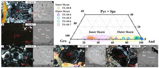 End-member diagram with microscope and Back-Scattered Electron (BSE) images of typical garnets in the TS-10 profile. (a) Grossularite from the inner skarn,(b–e) Andradite from the outer skarn. CorelKit was used for the projection here [33].