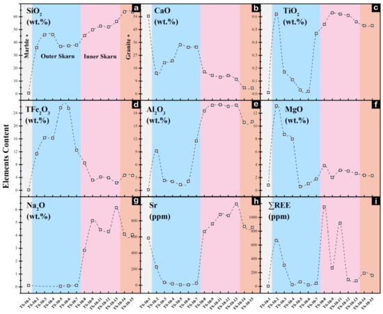 Geochemical variations of major elements in the TS-10 profile based on whole-rock analysis. (a–g) Trend of important major elements, (h,i) Trend of important trace element (Sr) and ΣREE. The labels of different color zones are shown in (a), gray-marble, bule-outer skarn, pink-inner skarn, orange-granite.
