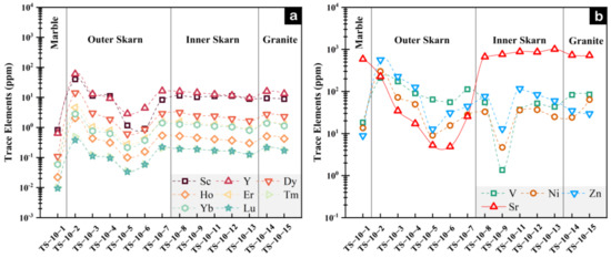 Some trace elements have the same evolutionary trend, such as REE and similar elements. The variations of Dy, Ho, Er, Tm, Yb, Lu, Y and Sc (Figure 8a) are consistent. Transition elements, such as Zn, V and Ni, also show consistent geochemical characteristics (Figure 8b). Overall, from the inner to the outer skarn, there is an obvious decreasing trend in Na, Al, Ti and Sr (Figure 7c,e,g and Figure 8b), indicating that these elements may have been lost during the evolution of the skarn. On the other hand, Fe, Mg, Zn, V and Ni (Figure 7d,f and Figure 8b) show an obvious increasing trend, indicating that these elements may have been enriched during the process of skarnization. At the boundary between the inner and outer skarn, represented by samples TS-10-8 and TS-10-7, Na, Al, Ti and Sr show an obvious decrease, while Fe, Mg, Zn, V and Ni show a significant increase, indicating that the boundary between the two samples is possibly the original contact interface between the rock body and carbonate.