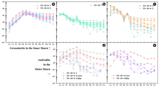 Chondrite-normalized REE patterns of garnets from TS-10 profile. (a) Grossularite in the Inner skarn. (b–e) Andradite in the Outer skarn.