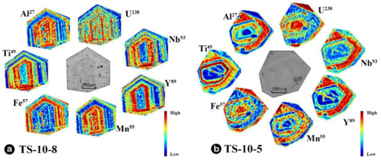 We conducted trace-element mapping on representative garnet crystals from the inner skarn TS-10-8 and the outer skarn TS-10-5. The garnet in TS-10-8 from the inner has a relatively high degree of idioblastic texture, and the overall shape is idioblastic to semi-idioblastic (Figure 6a). The mapping results show that the garnet has an Al-rich core and a Fe-rich rim, and more obvious zoning features can be observed (Figure 10a). Mn is enriched in the core and depleted in the rim, while Ti, Nb and Y elements are enriched in the middle part and depleted in the core and rim, indicating multiple growth stages. The garnet in sample TS-10-5 from the outer also has a good degree of idioblastic texture, and the overall shape is semi-idioblastic (Figure 6d). The mapping results show that the garnet has a Fe-rich core and an Al-rich rim, and obvious zoning features can be observed (Figure 10b). Ti, Mn, Y and Nb elements in TS-10-5 are depleted in the core and enriched in the rim.