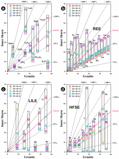 Isocon diagrams of the TS-10 profile from granite to inner skarn. (a) Migration trend of major elements, (b) Migration trend of REEs, (c) Migration trend of LILEs, (d) Migration trend of HFSEs. Normalization and plotting methods refer to Guo et al. (2009) [38]. The original data of the diagrams can be found in Supplementary Table S3a.