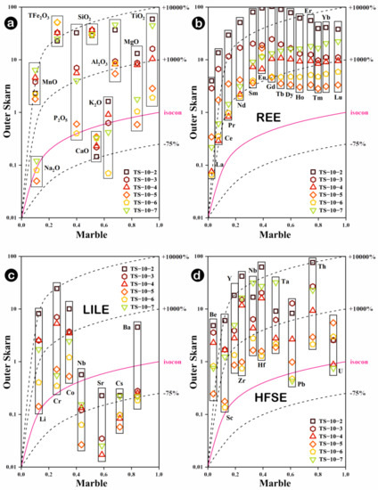 Isocon diagrams of the TS-10 profile from outer skarn to marble. (a) Migration trend of major elements, (b) Migration trend of REEs, (c) Migration trend of LILEs, (d) Migration trend of HFSEs. Plotting methods refer to Guo et al. (2009) [38]. Marble-outer skarn plots are not normalized and are drawn assuming a constant total system mass. Should be noted that this can only reflect the trend information, not an absolute quantitative analysis. The original data of the diagrams can be found in Supplementary Table S3b.