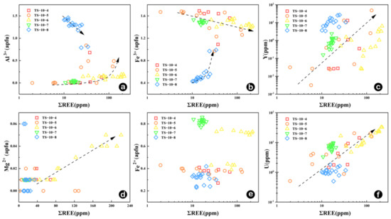 The relationship between total REE and Mg2+, Fe2+, Fe3+, Al3+, Y in the garnet from TS-10 profile. (a)Al3+ vs. ΣREE diagram, (b) Fe3+ vs. ΣREE diagram, (c) Y vs. ΣREE diagram, (d) Mg2+ vs. ΣREE diagram, (e) Fe2+ vs. ΣREE diagram, (f) U vs. ΣREE diagram. Atoms per formula unit (apfu) calculated based on 12 oxygen atoms as cation number.