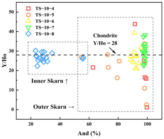 The Y/Ho ratio usually has important geochemical implications, as Y and Ho have similar ionic radii and valences and thus exhibit similar geochemical behaviors. Bau (1991) suggested that Y and Ho may exhibit significant fractionation in aqueous solutions, but partial melting or fractional crystallization of magma does not cause a significant fractionation of Y and Ho [53]. Therefore, when garnets are of hydrothermal origin, their Y/Ho ratios will deviate significantly from the Y/Ho value of chondritic meteorites (Y/Ho = 28). An imbalance in the chemical composition of the original rock or changes in the fluid composition during the crystallization of garnets can lead to a lack of correlation between Y and REEs. When the chemical composition of the original rock is relatively balanced or when changes in the fluid are small, Y and REEs show a positive correlation [14]. In our study, the Y/Ho ratio of the garnet in sample TS-10-8 from the inner skarn of the meta-igneous rocks is close to the value of chondritic meteorites and varies only slightly around 28 (Figure 14), indicating that the garnets were in a state of chemical equilibrium and were not significantly affected by fluids. The Y/Ho ratios of garnets in TS-10-4,5,6,7 from the outer skarn vary greatly and deviate significantly from the values of those in chondrites, suggesting an increased water-rock ratio during garnet formation. Furthermore, the formation temperature of andradite is lower than that of grossularite, as reported by Liang (1994) [54]. Consequently, as the temperature declines, hydrothermal fluids rich in metal elements separate from the magma, leading to an increased water-rock ratio. This process, in turn, contributes to the formation of clinopyroxene and significant variations in Y/Ho ratios at relatively lower temperatures.