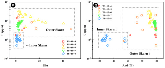 Consequently, U is a variable valence element, including U4+ and U6+. U4+ is highly reactive and easily migrates during fluid activity, while U6+ has low reactivity. Therefore, the U content in garnets may reflect the fO2 changes during their formation. Andradite usually forms in relatively oxidizing environments, while grossularite form in relatively reducing environments [1,2]. Near the rock body during skarn formation process, the temperature is relatively high and fO2 is relatively low. U mainly exists in the form of U4+ and migrates with the fluid towards the outer skarn, where it is enriched. This results in lower U content in the inner skarn when U enters the lattice of grossularite during its crystallization. In contrast, andradite formed in the outer exhibits higher fO2 characteristics, with U present as U6+, which subsequently precipitates in large quantities into the lattice of andradite. In the Tongshan skarn profile, we found garnets in the inner exhibit with relatively low U content, while those in the outer are enriched in U, adhering to the same principle (Figure 15a).