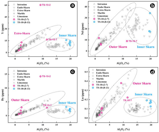 Al2O3 vs. Y, Nd, Dy, Lu diagrams. (a) Al2O3 vs. Y diagram, (b) Al2O3 vs. Nd diagram, (c) Al2O3 vs. Dy diagram, (d) Al2O3 vs. Lu diagram. Refering intrusion, inner skarn, outer skarn and marble data from appendix tables A2 of Mrozek et al. (2020) [8]. Limestone data from Mrozek et al. (2020) and Paz et al. (2015) [8,58].