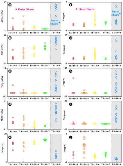 The whole-rock geochemical data of 14 samples from the TS-10 skarn profile are displayed in Supplementary Table S1. Among them, the mineral composition of the marble zone is 99% calcite, presenting the highest Ca content (approximately 54 wt%). In the skarn rock body, Ti, Al, Na and Sr exhibit the same evolutionary trend (Figure 7c,e,g,h), displaying enrichment in the inner skarn and depletion in the outer skarn. The changes in Ca, Fe and Mg are more pronounced (Figure 7b,d,f) and are generally enriched in the outer skarn. Ca initially increases gradually in the outer skarn, then decreases in the inner skarn, reaching a minimum in the granite zone (Figure 7b); the trend of Si and Ca changes is generally opposite, with the highest content in granite and the lowest in limestone (Figure 7a). Fe is more enriched, and its content progressively increases in the outer skarn (Figure 7d), while Al is more enriched, and its content remains relatively stable in the inner skarn (Figure 7e). This is consistent with the characteristic that the composition minerals of the outer skarn are mainly andradite and diopside, and the proportion of garnets with higher iron content increases from 10% to 88% towards the rock body (Figure 4). In contrast, feldspar, diopside, and epidote are widely developed in the inner skarn, while diopside is not present in the granite. This also results in higher Al content in the alteration zone compared to fresh granodiorite (TS-10-15) (Figure 7e).