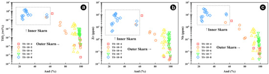 Skarn minerals, such as garnet, may also provide mineralogical constraints for distinguishing the boundary between inner and outer skarn. The Fe, In, Al, Mn, Ni, Ti, Zr and Nb contents of garnets in inner and outer skarn are significantly different. Garnets in inner skarn exhibit high concentrations of Al, Mn, Ni, Ti, Zr and Nb, whereas those in outer skarn possess lower levels of these elements but substantially higher Fe contents. The contents of these elements show a cliff-like change between the two types of skarn (Figure 17). Moreover, the contents of Ti, Zr and Nb elements in garnets show a negative correlation with the andradite end-member (And) of garnet (Figure 18). These mineralogical and chemical characteristics can be explained as follows: due to the relatively high formation temperature and the low water-rock ratio of inner skarn; immobile HFSE often accumulates in the grossularite formed during the high-temperature stage. In contrast, outer skarn has a high water-rock ratio and strong fluid activity, and immobile HFSE is not easily enriched in them. Therefore, the garnets formed in this area show low and fluctuating contents of these elements.