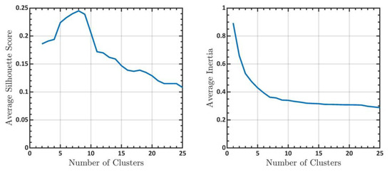 One challenge of k-means clustering is determining the appropriate number of k clusters such that data are classified meaningfully and descriptively. Two common methods for determining the appropriate number of clusters are silhouette analysis and elbow analysis. Silhouette analysis is performed by calculating the average silhouette score for k-means clustering models trained using various values of k and selecting the model with the highest score. The silhouette score is a measure of how similar points within the same cluster are and how dissimilar points from different clusters are [37]. The silhouette score ranges from –1 to 1, where 1 represents perfectly clustered data and –1 represents poorly clustered data.