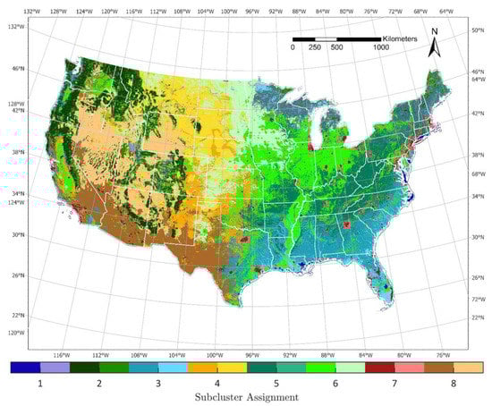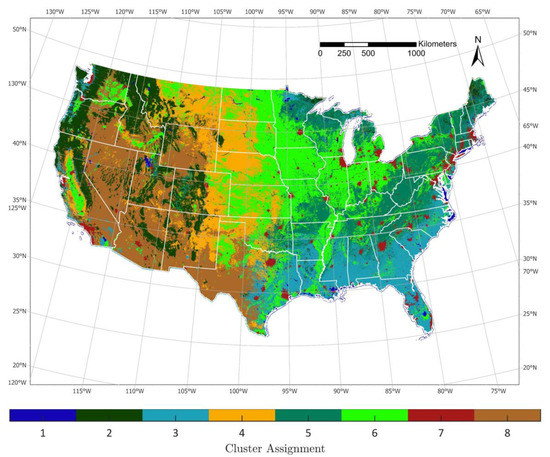 Letting k equal eight, k-means clustering was applied to the 51 geospatial layers for all of the CONUS using a 270-m spatial resolution. Each cluster was assigned a color and a map of the resulting clusters is shown in Figure 2.