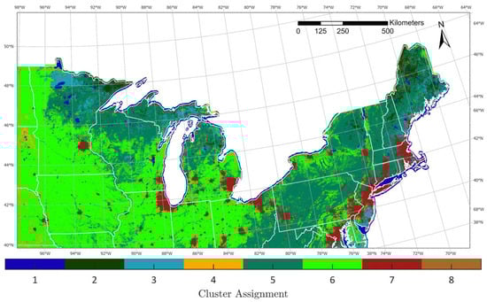 Cluster assignments in the Great Lakes region and Northeast as a result of clustering 51 geospatial features with a 270-m spatial resolution.