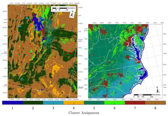 Figure 4 (right) shows a zoomed-in cluster map of the eastern/southeastern coastal plains, much of which are represented by Cluster 3, which is positively correlated with average winter dew point temperatures and wetlands. Deciduous forests are evident in Cluster 5 throughout much of the Piedmont and Appalachian Mountains. The coastline, bays, rivers, and lakes are grouped into Cluster 1, while urban/suburban areas are well-mapped in Cluster 7. In particular, the developed northern Virginia–Washington DC–Baltimore–Philadelphia corridor is striking.