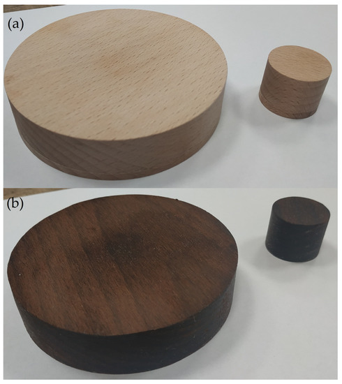 The study of the sound wave absorption coefficient was carried out in two stages. The same material was compared before and after thermal modification to obtain the values of the tested features. The analysed wood species were tested using an impedance tube during the first stage. In the second stage, the twin material was thermally modified. Samples were subjected to thermal modification by the most often used method, in a steam atmosphere, according to the procedure of ThermoWood [2,3,18,30]. The wood modification was carried out under industrial conditions at 190–213 °C. After the thermal treatment, the samples were conditioned under laboratory conditions (T = 20 °C and RH = 65%). When the samples reached the same equilibrium moisture content as before the modification, they were subjected to testing for the sound wave absorption coefficient. Due to using an impedance tube, in particular two tubes, the samples were in the form of discs with diameters of 29 mm and 100 mm. The thickness of each sample was 23 mm. Figure 1 shows an exemplary pair of samples made of beech wood before and after the thermal modification.
