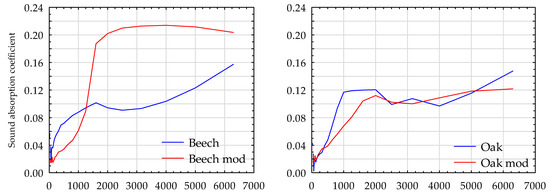 Sound absorption coefficient in beech, oak, red oak, and pine wood before thermal modification.