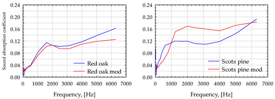 Based on Figure 6, it is possible to determine the impact of thermal modification on the value of the sound absorption coefficient in the wood of individual species. In the case of oak wood, the tested parameter obtained lower values in the frequency range of 500–2000 Hz after the thermal modification process. The most significant difference was noted at 1000 Hz, where the decrease was 43% compared to that of the control wood. In the case of red oak wood, the observed differences were minor. Beechwood, after modification, was characterised by a higher wave absorption coefficient than wood before thermal modification. The observed increase is visible for the frequency range 1500–5500 Hz, with the wave absorption coefficient value increasing by more than 100% for a frequency of 3000 Hz. Visible differentiation can be seen in the case of pine wood, where the sound absorption coefficient values also increased after the thermal modification of the wood. In the 800–4000 Hz frequency range, the increase was up to 25% compared to the results of the control wood. Therefore, the greatest increase in the analysed parameter was recorded in the wood with the lowest initial density (scots pine) and in the wood with the greatest density loss (beech wood).