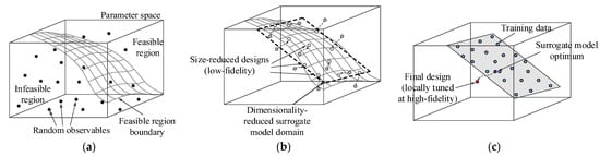 Visualization showing the main concepts of the introduced miniaturization framework. (a) Feasible and infeasible regions of the design space, along with the boundary between them. The random vectors are used for an approximation of the boundary of the feasible region. (b) Miniaturized designs (starting from automatically chosen observables) based on which surrogate model domain is identified in the vicinity of the boundary region using spectral analysis []. (c) Allocation of training data samples and construction of a kriging surrogate. Subsequently, the surrogate is globally optimized, and the solution is refined at the level of a high-fidelity model using a gradient-based procedure.