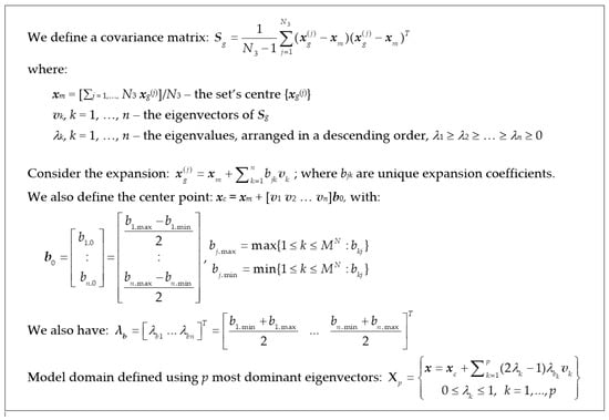 Procedure for surrogate domain identification with dimensionality reduction using spectral analysis of the observable set [] (for details see []). Notation: Sg—covariance matrix, N3—the number of the pre-optimized designs with the lowest constraint violation; {xg(j)}—the observable set; xm—the center of the observable set; xc—the center point; vk—the eigenvectors of Sg; λk—the eigenvalues of Sg; bjk—expansion coefficients.