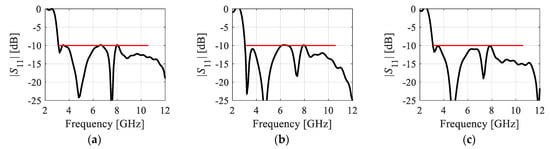 Reflection responses of Antenna IV for three representative designs yielded using the introduced miniaturization framework: (a) design 1 (footprint area 418 mm2), (b) design 2 (footprint area 399 mm2), and (c) design 3 (footprint area 427 mm2). Target operating band marked using the horizontal line.