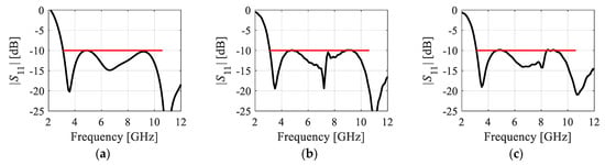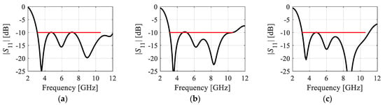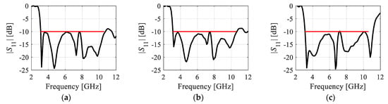 Reflection responses of Antenna II for representative designs yielded using the introduced miniaturization framework: (a) design 1 (footprint area 189 mm2), (b) design 2 (footprint area 182 mm2), and (c) design 3 (footprint area 228 mm2). Target operating band marked using the horizontal line.