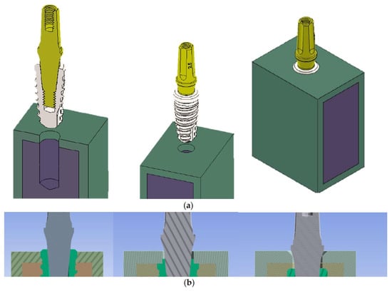 (a) Modelling of the three components: bone (cortical in green and cancellous in violet), screw (in white), and abutment (in yellow) using Autodesk Inventor (San Francisco, CA, USA); (b) Insertion of the equicrestal (0 mm) and subcrestal (−1 mm and −2 mm) implants (the abutment in grey and the screw in green) into the bone (cortical in light green and cancellous in brown) using Ansys Workbench (Canonsburg, PA, USA).