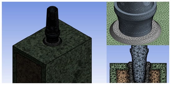 The accuracy of results proved to be strongly dependent on the convergence testing process and the mesh quality [33,34,35]; thus, the mesh element size chosen for this research was established at 0.5 mm of tetrahedral elements in the part of the screw and bone. Contrarily, on the lower surface of the abutment, a mesh refinement was performed in order to achieve a more accurate distribution of Von Mises stress. This area is considered critical when the implant is subjected to inclined loads, as supported by existing literature [35]. Mesh refinement can be useful in solving problems that require more precise details of the model or involve high stress gradients, such as analyzing complex structural components or simulating fluid flows. However, it is important to note that excessive mesh refinement can lead to longer computation times and increased complexity in managing the results. Therefore, it is essential to balance the mesh refinement based on the problem specifications and available computational resources to obtain reliable and efficient results. In this case, a mesh refinement was applied, resulting in a reduction of the element size to 0.3 mm in the abutment portion (Figure 4).