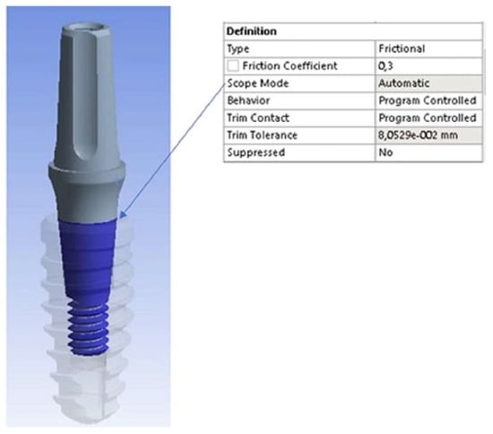 The friction generated between the abutment and the dental implant is an important factor to consider when designing and installing a dental implant. Indeed, the final goal is obtaining adequate stability and tightness between the abutment and the implant, in order to guarantee the absence of micromovements at the implant–abutment connection zone and a long-term implant stability. An appropriate level of friction between the abutment and the implant is desirable to avoid those micro-movements that could compromise the integrity of the interface, prevent the loss of the prosthetic material and the abutment mobility, as well as reduce the risk of bacterial infiltration by creating a suitable bacterial seal. A frictional coefficient of 0.3 was set as the implant–abutment contact condition in the present FEA study (Figure 5). Between the implant and the bone, on the other hand, a fixed type of contact was considered, without any type of micromovement. This hypothesis is validated from the moment in which the osseointegration between the two surfaces occurs. The software used for the FEA simulation was Ansys Workbench (Canonsburg, PA, USA). The application of FEA to dental implants raises important ethical considerations related to scientific validity, informed consent, respect for the limits of the method sharing of results, and benefit to patients.