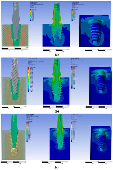 Von Mises stresses in the three analyzed implant models: (a) equicrestally, (b) subcrestally (−1 mm), and (c) subcrestally (−2 mm) positioned.