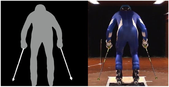 Data were collected while the subjects were standing inside a closed-loop wind tunnel (12.5 m long, 2.7 m wide, 1.8 m high, contraction ratio 1:4.23) equipped with a 220 kW centrifugal blower that can produce wind speeds up to 30 m/s. The standard deviations associated with the measurements were 0.14 m/s and 1.8 N for wind speed and aerodynamic drag force, respectively. Aerodynamic drag was measured with a force platform (model 9286AA, Kistler Instrument Corp., Winterthur, Switzerland), which was set to zero prior to each test under windless conditions. The cross-sectional area of the poles (Sp) and the total cross-sectional area of the skier (S) were assessed by application of click-based interactive segmentation [18] to the images taken in the coronal plane from behind with an HDR-HC7 camcorder purchased from the Sony Corporation (Tokyo, Japan) (Figure 1). Fifteen images (5 in each of the three positions) were re-processed to determine the reproducibility of the measurement of cross-sectional area, resulting in a difference of 0.31 ± 0.24% (mean ± SD).