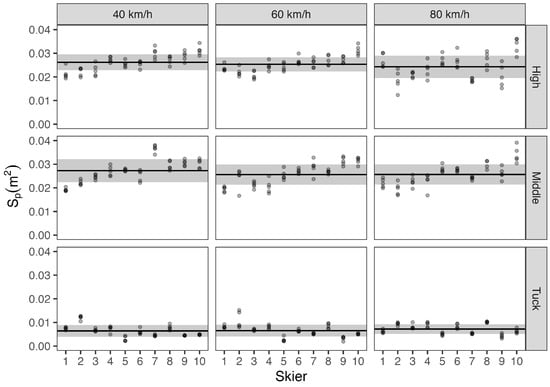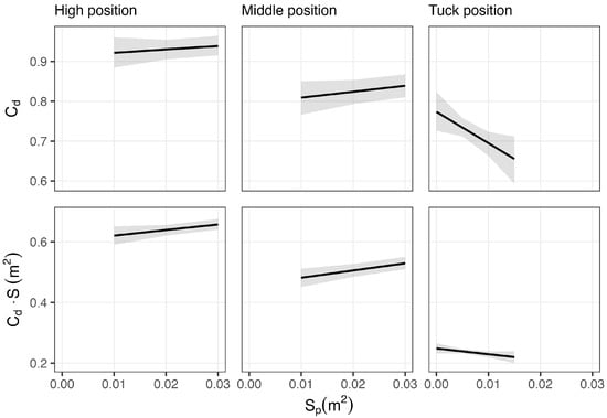 As might be expected, we observed a probable positive effect of Sp on Cd in both the middle and high positions and on Cd∙S in the high position, such that a change in Sp of 0.01 m2 might alter Cd and Cd∙S by as much as 0.02 m2 (Table 2). More surprising were the negative effects of Sp on Cd and Cd∙S in the tuck position, implying that these values both decrease with increasing Sp. The finding is probably due to the fact that the less favorable positioning of the poles (larger Sp) allows more favorable aerodynamic positioning of the skier. For example, if the skier inclines the poles slightly more forwards (tips higher than the grips), this would allow a lower, more aerodynamic positioning of the head and torso, which contribute strongly to the total aerodynamic drag [8,28].