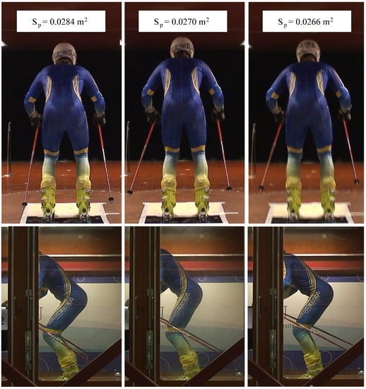 The middle position was taken by “Skier 8” during one of the tests at 40 (left), 60 (middle), and 80 km/h (right). At the top is the posterior view and at the bottom is the sagittal view. Sp—cross-sectional area of the poles.