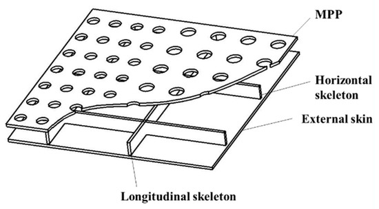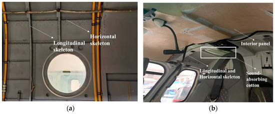 Figure 1 depicts the cabin noise spectrum of an S-76 helicopter cabin [4,5]. Clearly, the helicopter cabin noise is mostly medium–high-frequency line-spectrum noise with multiharmonic, multifrequency, and high-level characteristics. Currently, helicopter cabin noise control is mainly based on the addition of porous sound-absorbing materials, honeycomb structures, and damping materials to the cabin wall sandwich to reduce sound energy propagation through vibration isolation and sound absorption techniques [6,7]. Two helicopter cabin wall panel structures are illustrated in Figure 2. As can be seen, the helicopter nacelles typically have a semi-thin-walled structure consisting of an external skin and longitudinal and transverse skeletons. Some civil helicopter models are equipped with interior panels, and their air-back cavities are often filled with sound-absorbing cotton and foam for acoustic treatment. This type of material has limited ability to control low- and medium-frequency noises and has a large additional mass, which affects the overall performance of the helicopter to some extent [5].