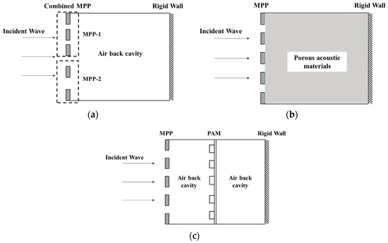 Schematic of the three MPP composite sound absorption structures: (a) Combined MPP; (b) MPP+Porous; (c) MPP+PAM.