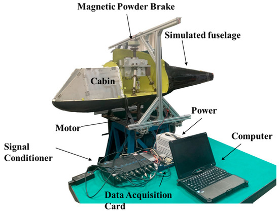 The sound field test system in the cabin of the model helicopter is depicted in Figure 8, and the magnetic powder brake and other measurement and control hardware parameters are listed in Table 5. The test system scheme mainly consisted of the model helicopter, simulated cabin, and measurement and control subsystem. The MPP composite sound absorption structure was installed at the interior trim panel, replacing the original wall panel, and the vibration and noise levels were measured and analyzed before and after installation of the composite acoustic structure.