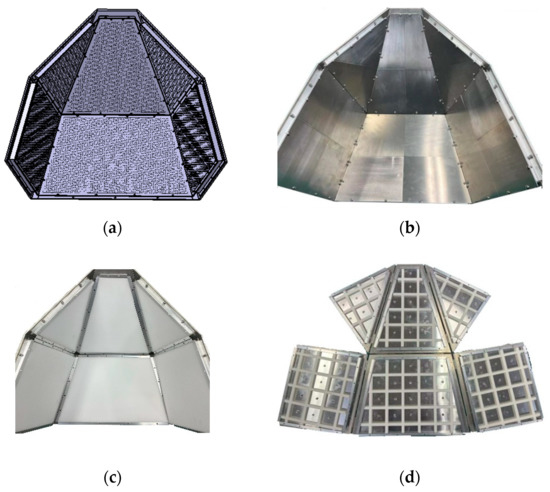 To facilitate the installation and removal of the MPP composite sound absorption structure, the simulated cabin was divided into six independent double-layer plate structures using fasteners to connect the plates. The interior trim plate was removable to facilitate the installation of the MPP. The back cavity behind the plate was used to fill the porous material and thin-plate-type acoustic supermaterial. The design diagram and physical drawing are displayed in Figure 9.