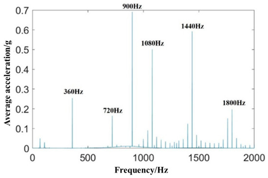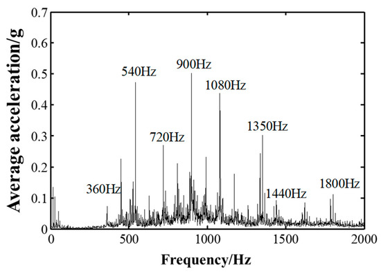 The measured acceleration spectrum in the 0–2000 Hz frequency band of the main reducer housing is shown in Figure 11. In the target frequency band of 500–2000 Hz, the gear meshing frequencies and their harmonic frequencies generated by the main reducer are mainly distributed at 360, 540, 720, 900, 1080, 1350, 1440, and 1800 Hz. In addition to the harmonic components in the design scheme, other frequency components, such as those at 540 Hz and 1350 Hz, also exist; these are crossover and multiplication components owing to gear wear, clearance, and other nonlinear factors.