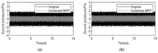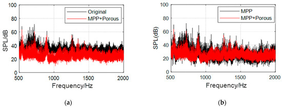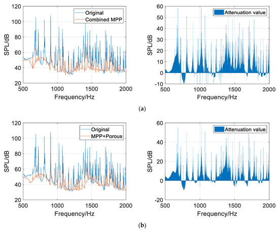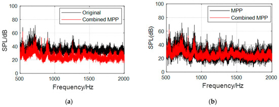 Comparison of the overall noise in the cabin before and after the installation of the Combined MPP. (a) Original. (b) MPP.