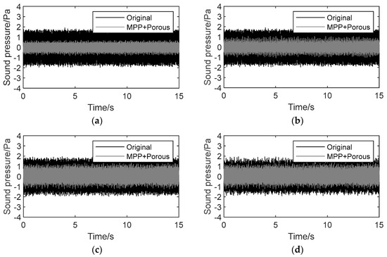 Sound pressure values at typical locations in the cabin (MPP+Porous). (a) Microphone 1. (b) Microphone 2. (c) Microphone 3. (d) Microphone 4.